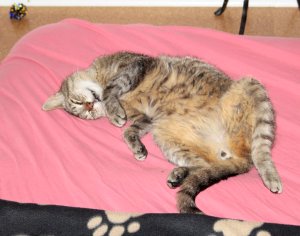 Die Zusammenführung mit den Hunden, die er kannte, klappte ohne Probleme. Wir achten sehr darauf, dass ihn die Hunde nicht bedrängen. Mittlerweile schlafen sie sogar in geringem Abstand nebeneinander. Eine Zusammenkunft der Katzen wird nicht erfolgen, Willi ist leider Coronavirus- träger. Da Willi eine massive Stomatitis und faule Zähne hatte, wurde er am 12.07.2018 operiert. Leider mussten alle Zähne, bis auf einen Reisszahn, gezogen werden. Sein Zahnfleisch ist regelrecht zerfressen und man kann den Kieferknochen sehen. Nach der Narkose hat Willi erst mal sehr lange geschlafen. Mit Wasser verdünnte Sahne, gemischt mit Katzenaufzuchtsmilch hat er viel und gerne getrunken. Baby paté konnte er bereits abends fressen. Erschwerend für ihn ist auch der Katzenschnupfen und zusätzlich Durchfall. Doch es nutzt ja nichts, wenn er Diätfutter nicht annimmt und sich das Medikament gegen Durchfall überall in der Wohnung befindet nur nicht in seinem Mäulchen. Diese Zwangsapplikation habe ich nicht durchgehalten. Zum Glück hat er nur ein- bis zweimal pro Tag weichen Stuhlgang. Am 18.07.2018 war die erste Kontrolluntersuchung. Die Entzündung ist noch immer vorhanden. Willi trinkt viel und er frisst - wenn auch nur das was er möchte. Willi hat bei der letzten Kontrolluntersuchung am 08.08.2018 ein Kilo zugenommen. Die Leukozyten sind zwar nicht mehr ganz so erschreckend hoch, aber leider ist die Entzündung noch immer vorhanden. Da es eine ernsthafte Erkrankung des Kiefer- knochens ist, muss er weiterhin Antibiotika bekommen. Wir sind nun alle 3 Tage mit ihm beim Tierarzt, da er die Antibiotika Tabletten nicht mehr nimmt und Spritzen bekommt. Da er seit der Spritzen wieder ziemlich schlapp ist, haben wir als zusätzliche Hilfe für ihn eine Tierheilpraktikerin konsultiert.